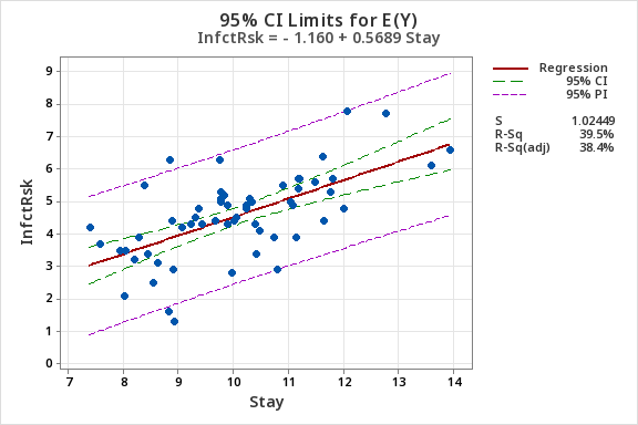 - Find a confidence interval and a prediction interval for the response to calculate 95% confidence intervals for E(InfctRsk) at Stay = 10 and 95% prediction intervals for InfctRsk at Stay = 10.
