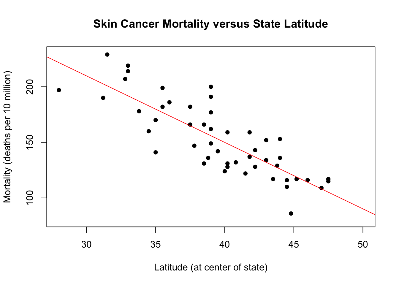 main="Skin Cancer Mortality versus State Latitude",