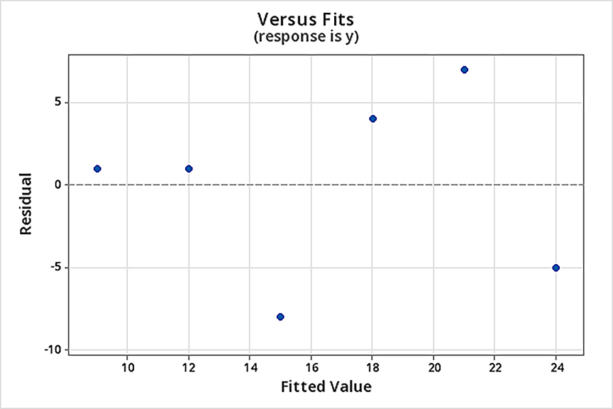 The least squares estimate from fitting a line to the data points in Residual dataset are \(b_{0}\) = 6 and \(b_{1}\) = 3. (You can check this claim, of course).