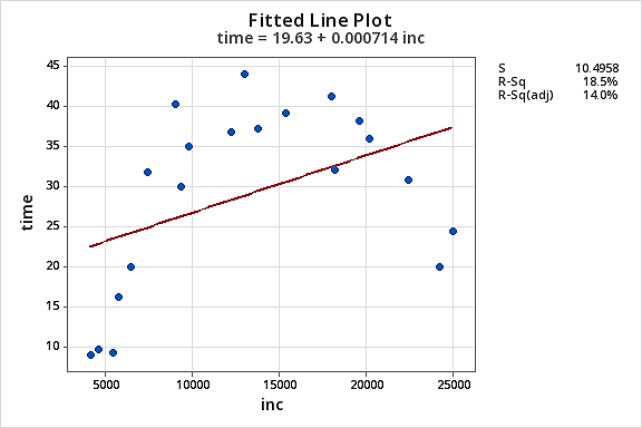 - Fit a simple linear regression model using Minitab’s fitted line plot treating \(vo_2\) as the response y and dur as the predictor x. (See Minitab Help Section - Creating a fitted line plot). Does there appear to be a linear relationship between and dur?
