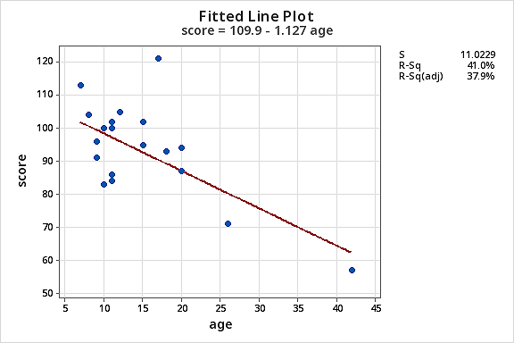- Fit a simple linear regression model using Minitab’s fitted line plot treating \(vo_2\) as the response y and age as the predictor x. Does there appear to be a linear relationship between \(vo_2\) and age?