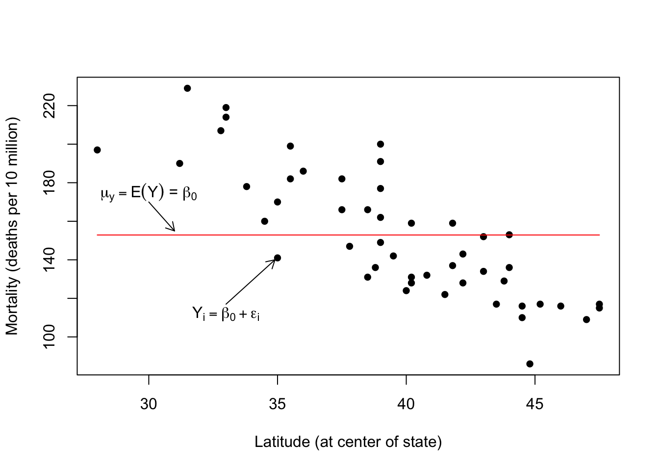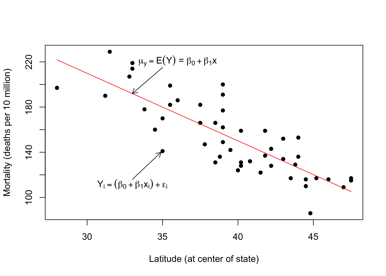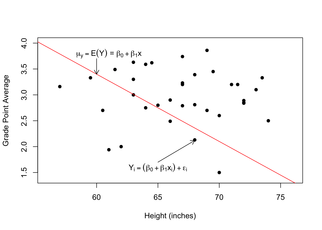 \[y_i=(\beta_0+\beta_1x_{i1})+\epsilon_i\]