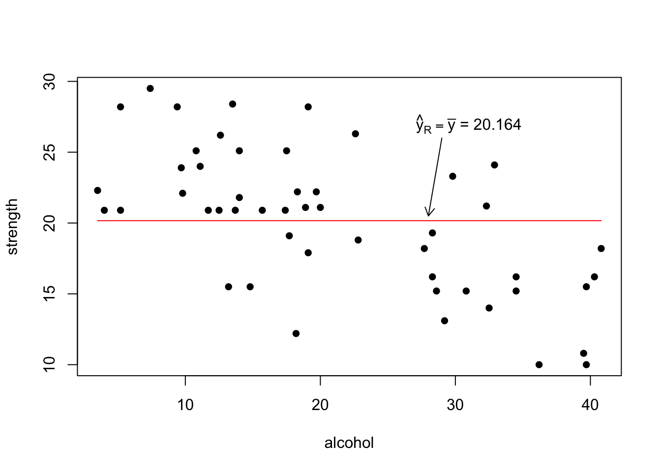 The”reduced model,” which is sometimes also referred to as the “restricted model,” is the model described by the null hypothesis \(H_{0}.\) For simple linear regression, a common null hypothesis is \(H_{0} : \beta_{1} = 0.\) In this case, the reduced model is obtained by “zeroing out” the slope \(\beta_{1}\) that appears in the full model. That is, the reduced model is: