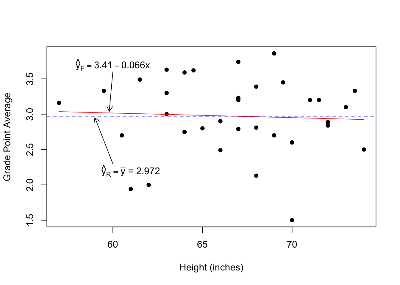 Let’s take another look at the plot of student grade point average against height, but this time with a line representing what the hypothesized population regression line might look like for the reduced model: