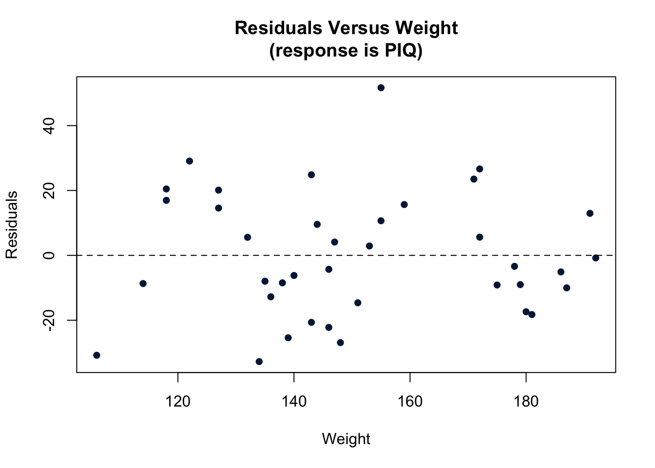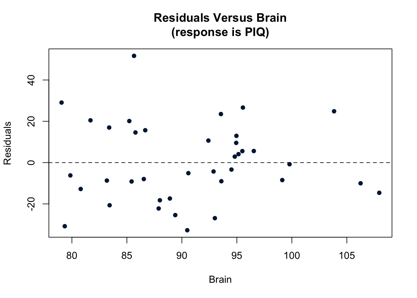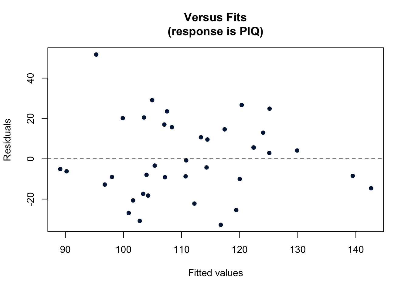 - the (vertical) spread of the residuals remains approximately constant as we scan the plot from left to right (this affirms the “E” condition);