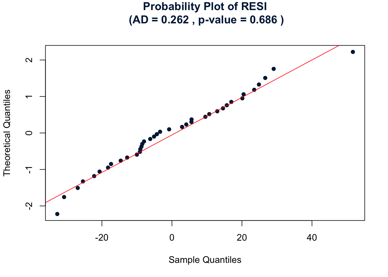 - Display a normal probability plot of the residuals and add a diagonal line to the plot. The argument “datax” determines which way round to plot the axes (false by default, which plots the data on the vertical axis, or true, which plots the data on the horizontal axis).