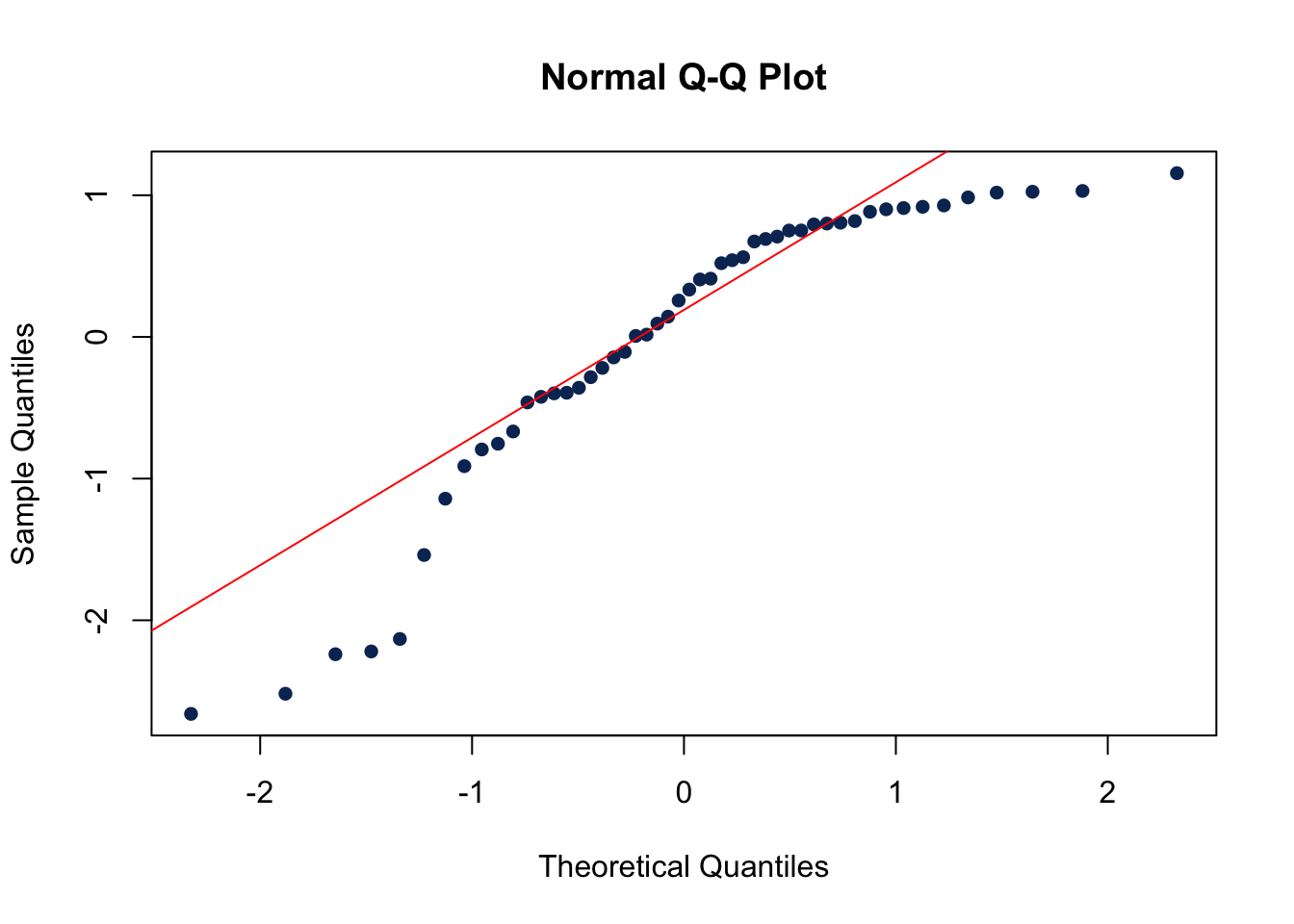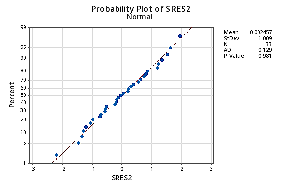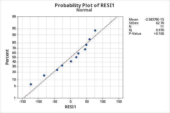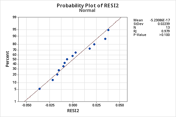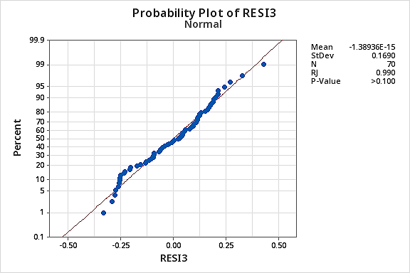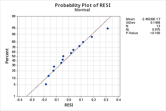 Again the Ryan-Joiner P-value is large, so we fail to reject the null hypothesis of normal error terms. There is not enough evidence to conclude that the error terms are not normal.
