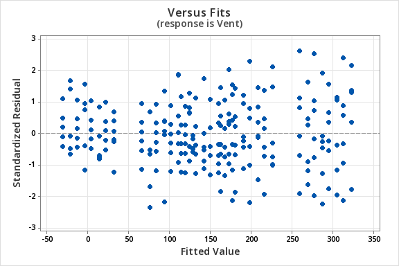 - Fit a multiple linear regression model of Vent on O2 + CO2 + Type.