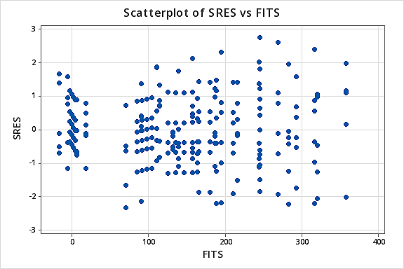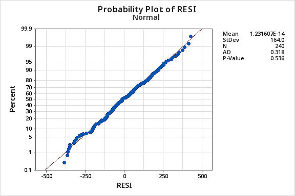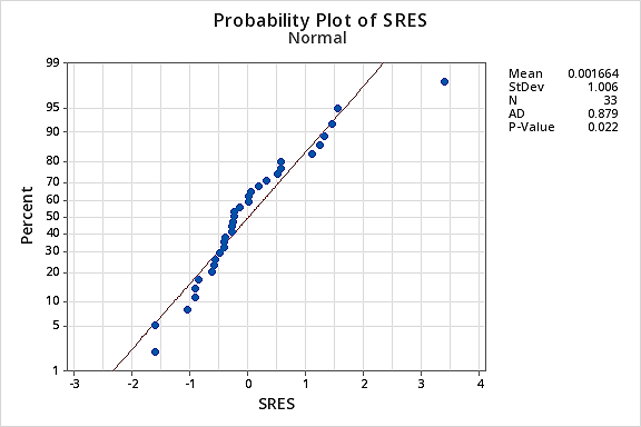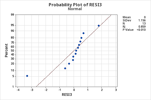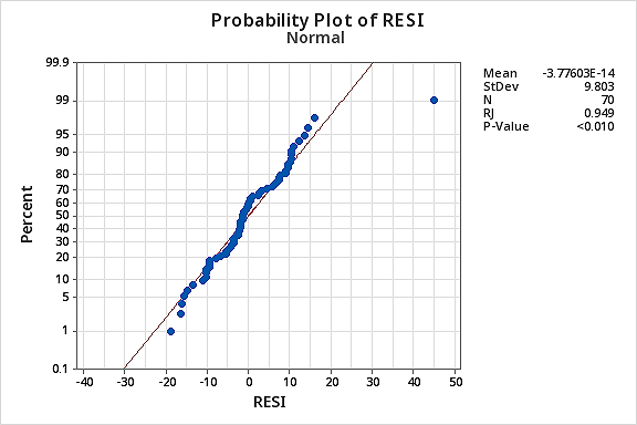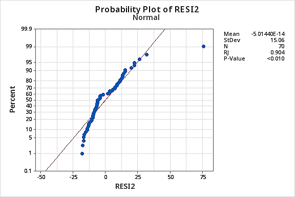 …but now we have non-normal error terms! The Ryan-Joiner P-value is smaller than 0.01, so we reject the null hypothesis of normal error terms. There is sufficient evidence to conclude that the error terms are not normal: