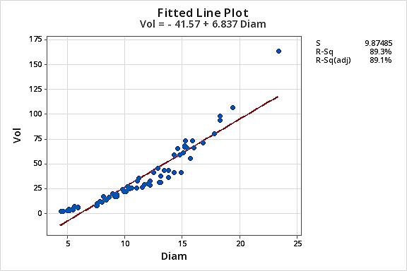 - Fit a simple linear regression model of Vol on Diam.
