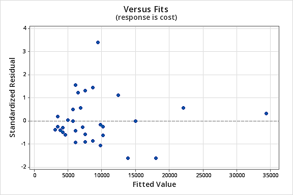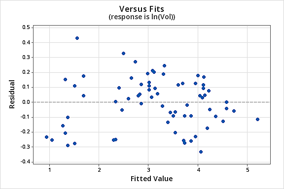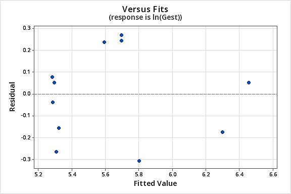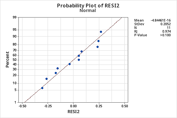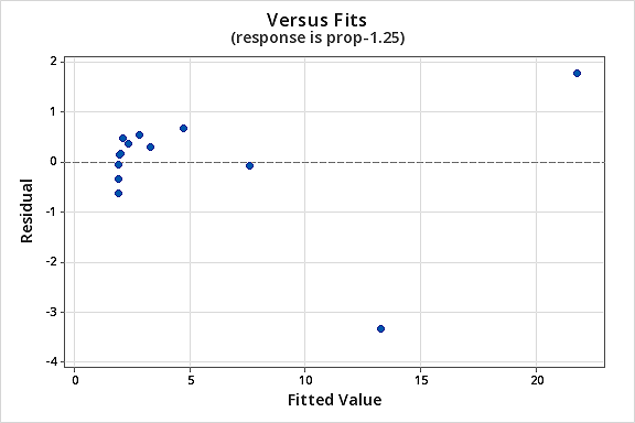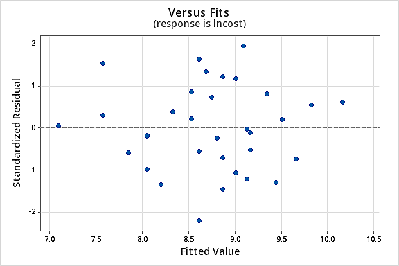You might become concerned about some kind of an up-down cyclical trend in the plot. We caution you again not to over-interpret these plots, especially when the data set is small like this. You really shouldn’t expect perfection when you resort to taking data transformations. Sometimes you have to just be content with significant improvements. By the way, the plot also suggests that it is okay to assume that the error variances are equal.
