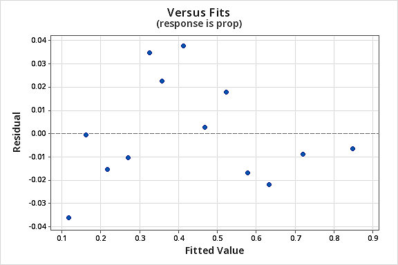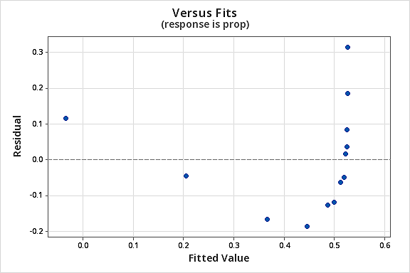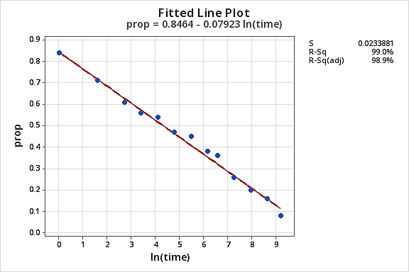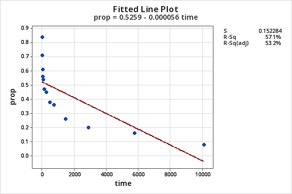 Now that we’ve transformed the predictor values, let’s see if it helped correct the non-linear trend in the data. We re-fit the model with \(Y = prop\) as the response and \(X = lntime\) as the predictor.