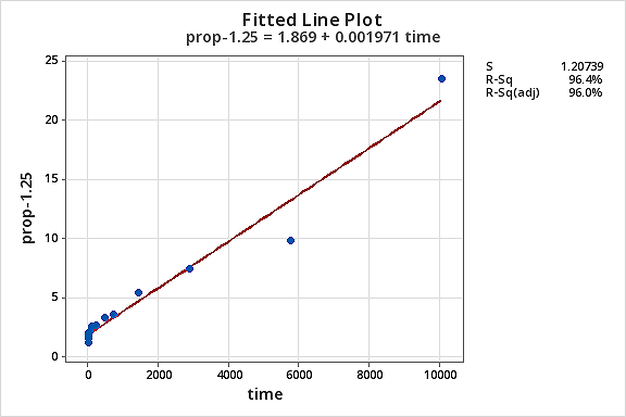 By trial and error, we discover that the power transformation of Y that does the best job at correcting the non-linearity is \(Y^{-1.25}.\) The fitted line plot illustrates that the transformation does indeed straighten out the relationship — although admittedly not as well as the log transformation of the X values.