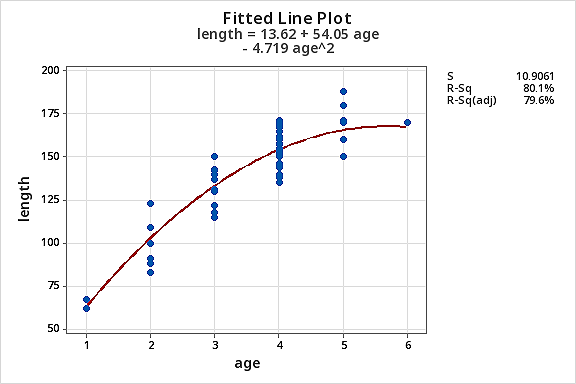 - Create an age-squared variable and fit a multiple linear regression model of length on age + agesq.