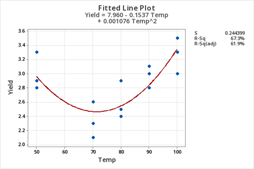 - Create a Temp-squared variable and fit a multiple linear regression model of Yield on Temp + Tempsq.