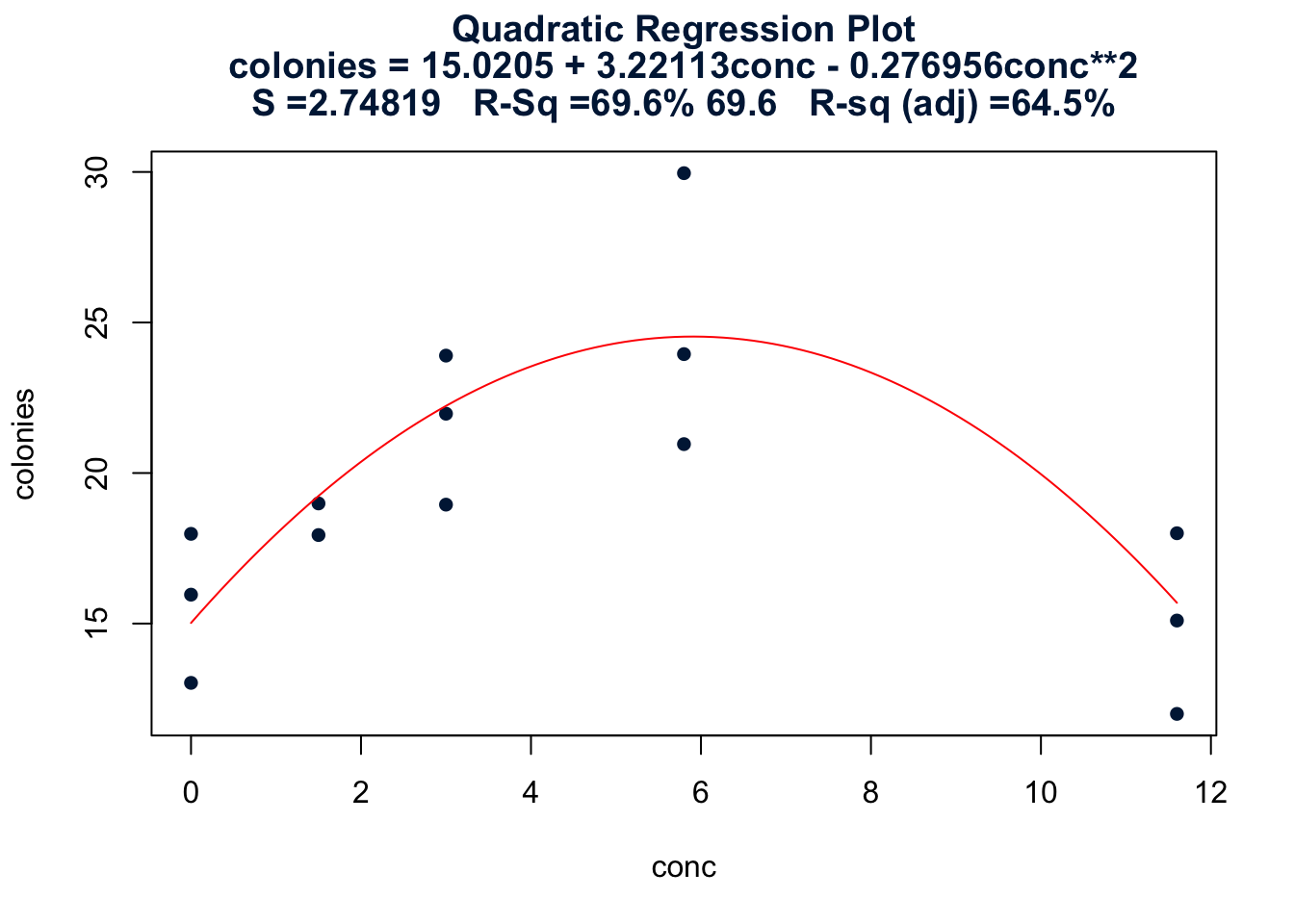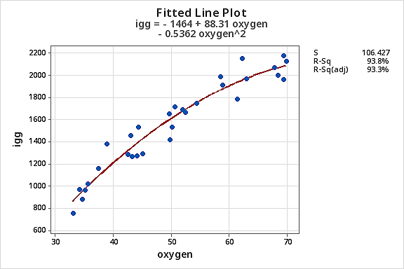 - Fit a quadratic regression model of igg vs oxygen + oxygensq.