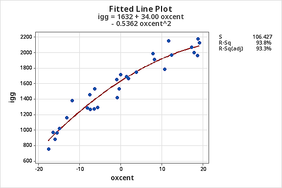 - Fit a quadratic regression model of igg vs oxcent + oxcentsq.