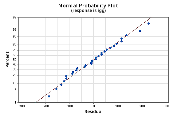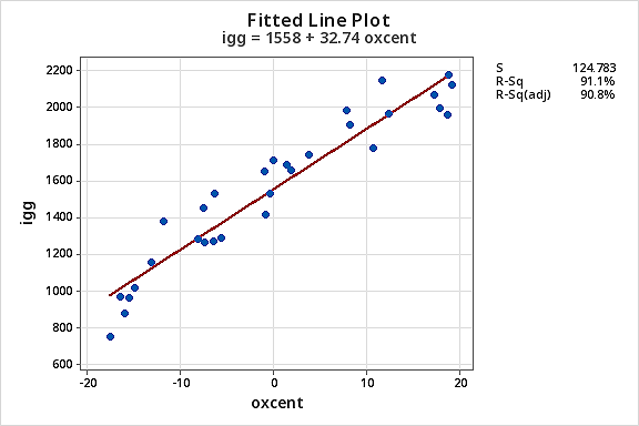 - Fit a simple linear regression model of igg vs oxcent.