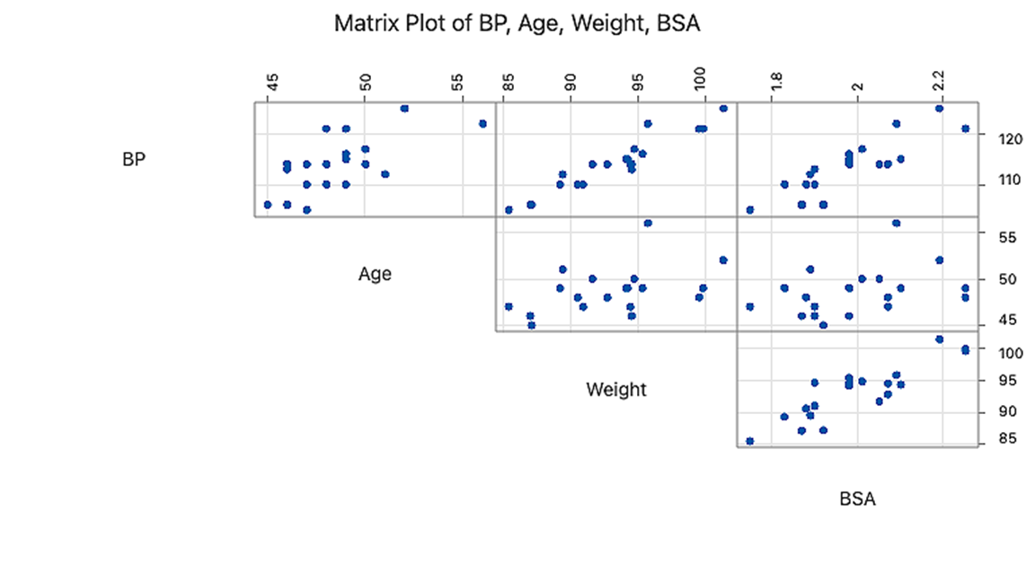 {#fig-matrixplotbsa .lightbox fig-alt="Matrix Plot of BP, Age, Weight, BSA" fig-align="center" width="70%"}
