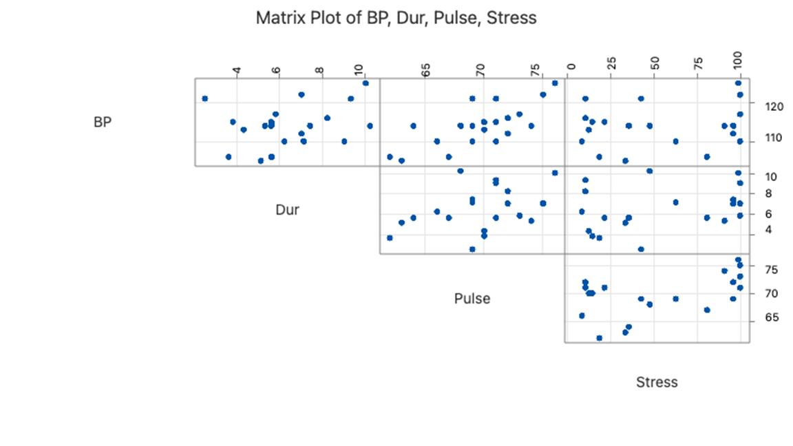 and the matrix plot of *BP*, *Dur*, *Pulse*, and *Stress*: