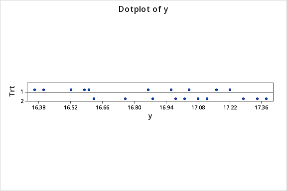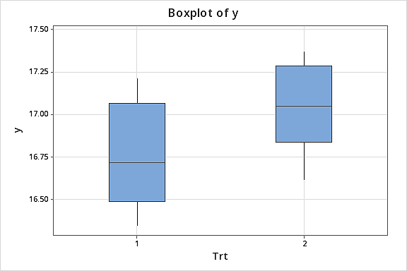 This example is a case where the two groups are different in terms of the median, which is the horizontal line in the box. One cannot be sure simply by visualizing the data if there is a significant difference between the means of these two groups. However, both the box plots and the dot plot hint at differences.
