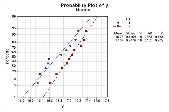 For the two-sample t-test, both samples are assumed to come from Normal populations with (possibly different) means \(\mu_i\) and variances \(\sigma^2\). When the variances are not equal we will generally try to overcome this by transforming the data. Using a metric where the variation is equal we can use complex ANOVA models, which also assume equal variances. (There is a version of the two sample t-test which can handle different variances, but unfortunately, this does not extend to more complex ANOVA models.) We want to test the hypothesis that the means \(\mu_i\) are equal.