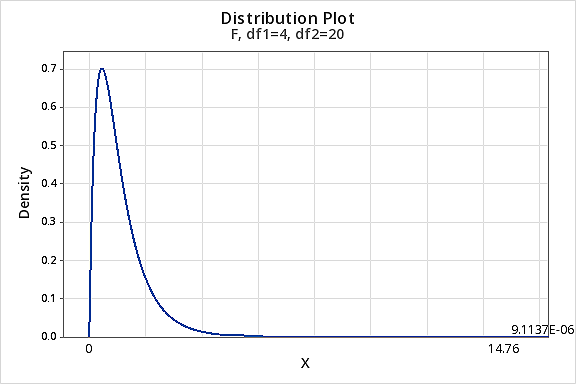 Note a very large F statistic that is, 14.76. The p-value for this F-statistic is < .0005 which is taken from an F distribution pictured below with 4 and 20 degrees of freedom.