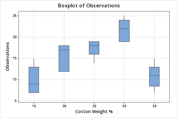 The box plot of the results shows an indication that there is an increase in strength as you increase the cotton and then it seems to drop off rather dramatically after 30%.