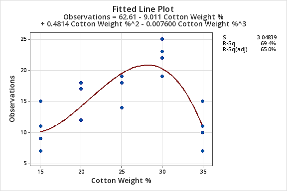 The regression equation is Observations = 62.61 - 9.011 Cotton Weight % + 0.4814 Cotton Weight %^2 - 0.007600 Cotton Weight %^3