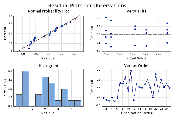 These plots don’t look exactly normal but at least they don’t seem to have any wild outliers. The normal scores plot looks reasonable. The residuals versus the order of the data plot are a plot of the error residuals data in the order in which the observations were taken. This looks a little suspect in that the first six data points all have small negative residuals which are not reflected in the following data points. Does this look like it might be a startup problem? These are the kinds of clues that you look for… if you are conducting this experiment you would certainly want to find out what was happening in the beginning.