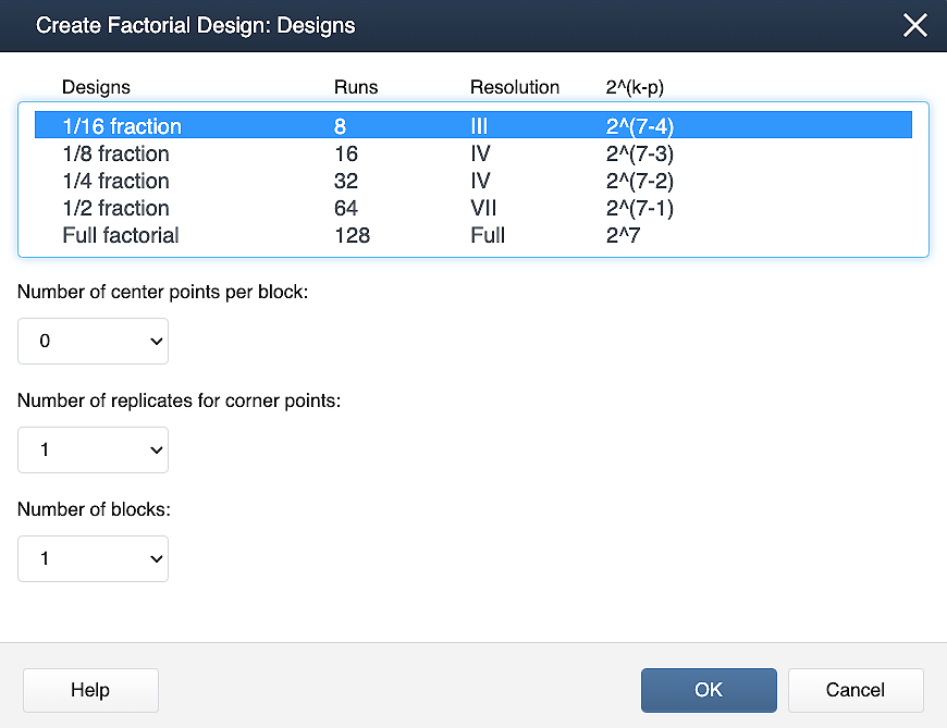 In summary, when you fold over a Resolution III design on all factors, then you get a Resolution IV design. Look at the table of all possible designs in Minitab below: