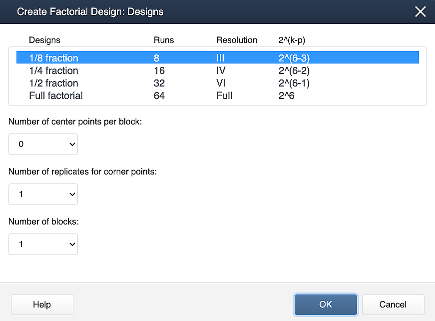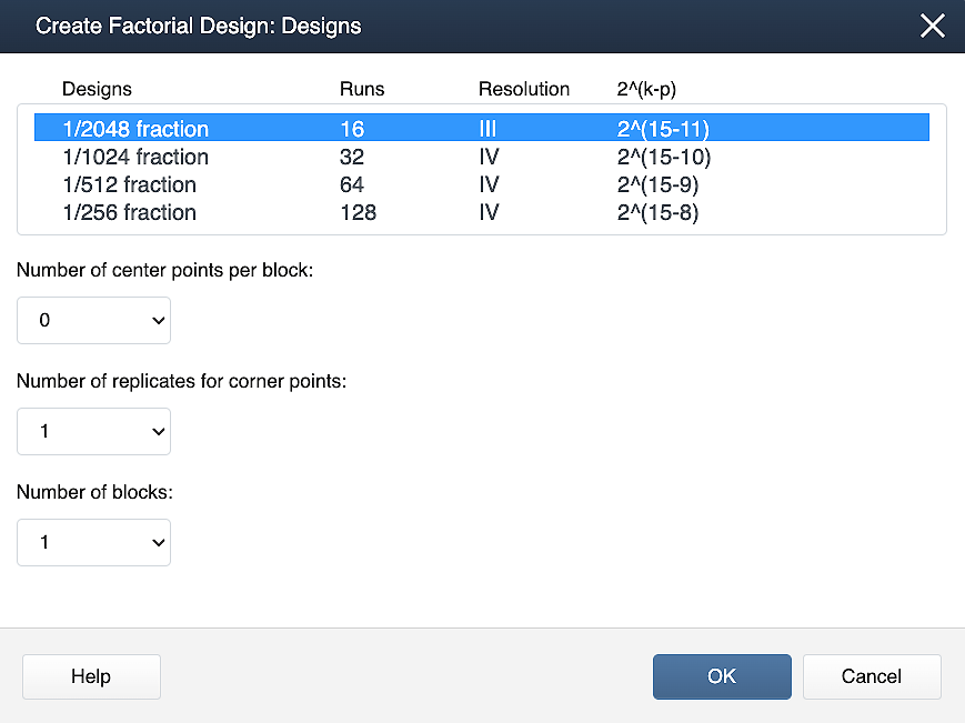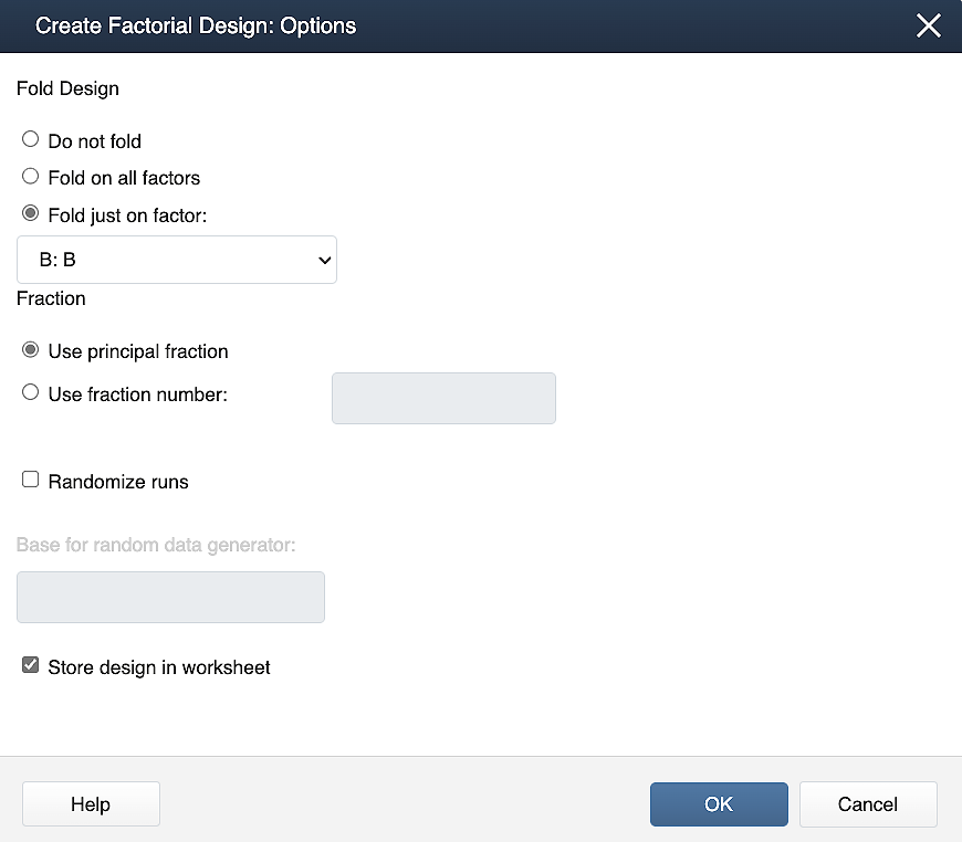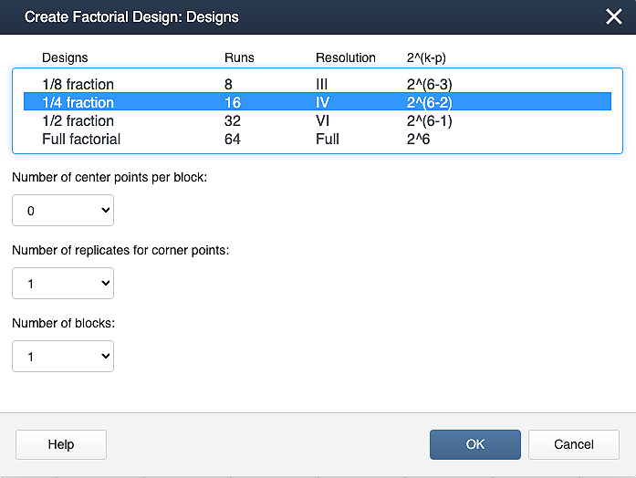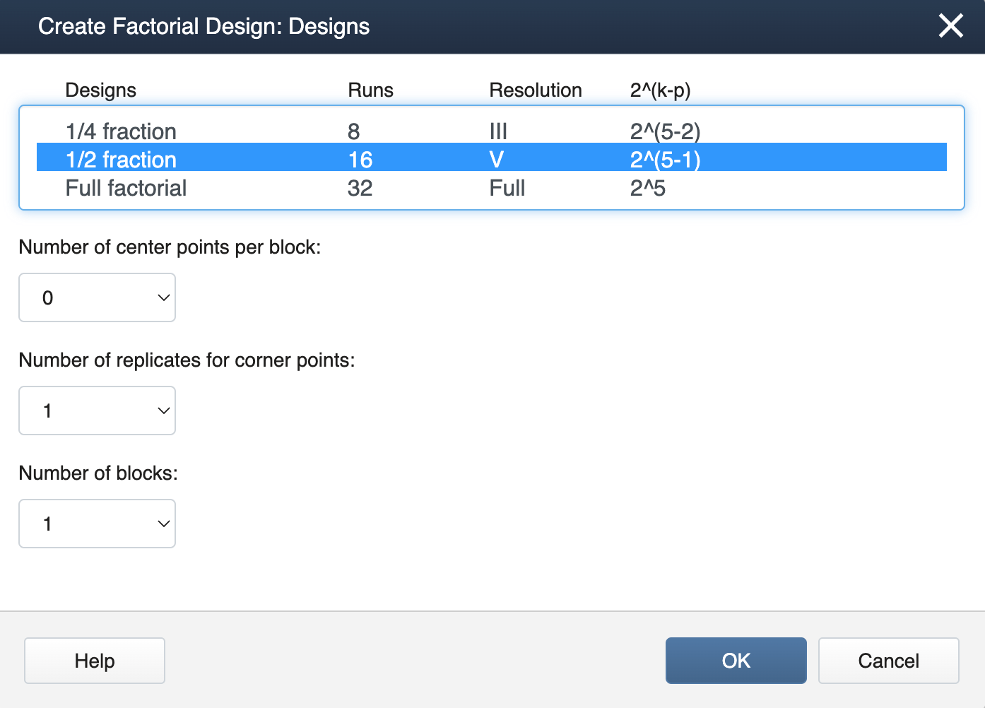 Let’s use Minitab to set this up. Minitab gives us a choice of a one half or one-fourth fraction. We will select the one-half fraction. It says it is a Resolution V design because it has a five letter generator I = ABCDE or (E = ABCD).