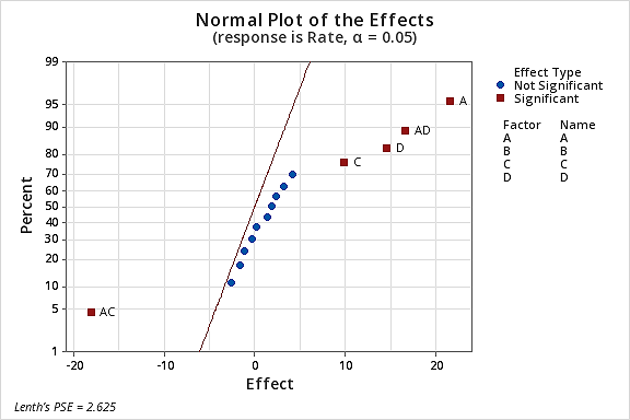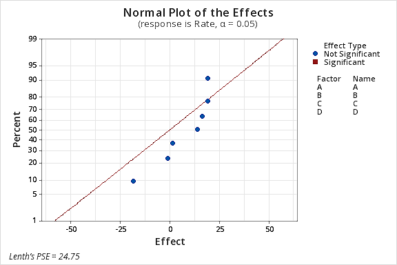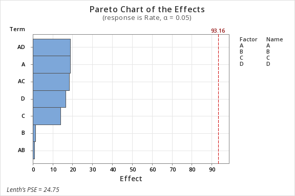 Using Minitab we can ask for up to 47 factors. In doing so you want to select a sufficient number of runs over the number of factors so that you have a reasonable number of degrees of freedom for error. At this stage a statistical test really isn’t that important, you are just screening for a place to start.