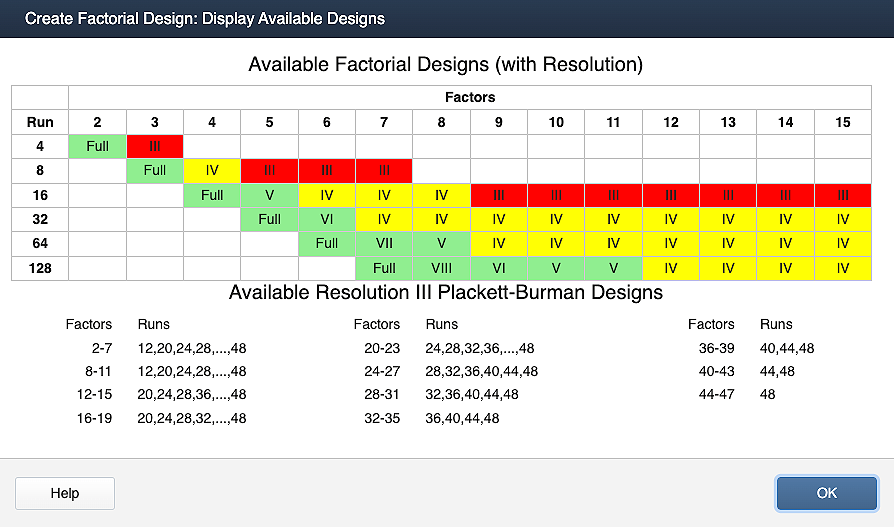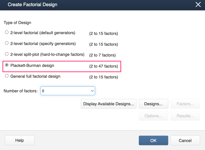 So, if you have 2 to 7 factors you can create a Plackett-Burman design with 12, 20, 24, … up to 48 observations. Of course, if you have 7 factors with eight runs then you have a saturated design.